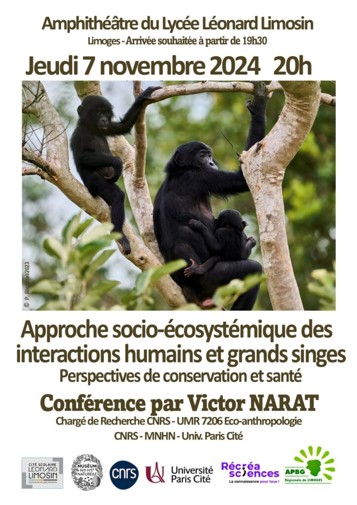 Conférence 07/11/1024 : « Approche socio-écosystémique des interactions humains- grands singes : perspectives de conservation et de santé » par Victor NARAT.