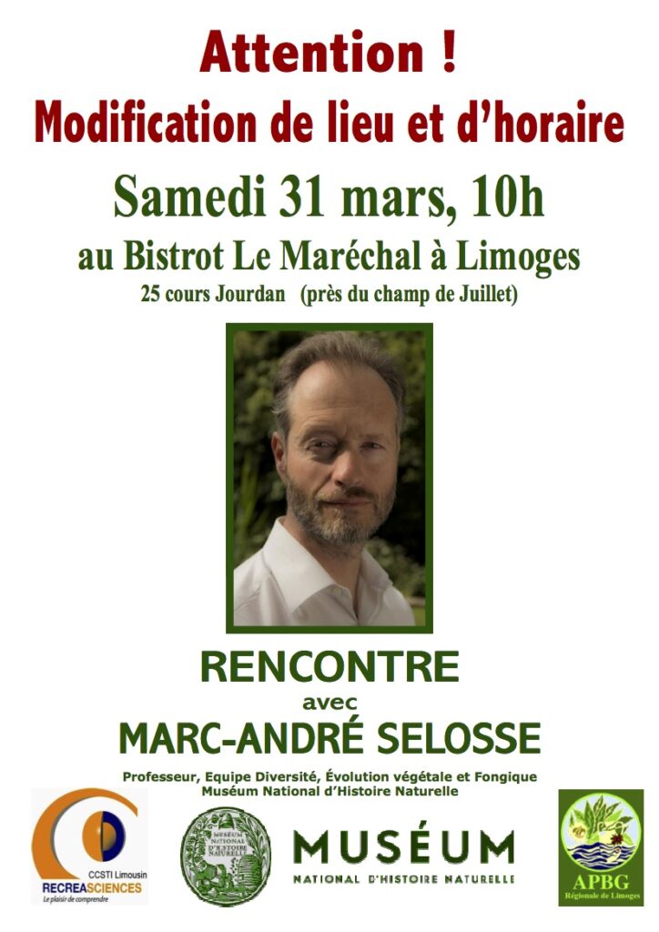 Suite à la fermeture du café littéraire de Limoges la semaine passée pour une durée indéterminée à l’heure actuelle, Récréasciences et la Régionale de l’APBG avons été dans l’obligation de trouver un autre lieu pour échanger avec Marc-André Selosse le samedi 31 mars 2018 et donc d’en modifier aussi l’horaire.